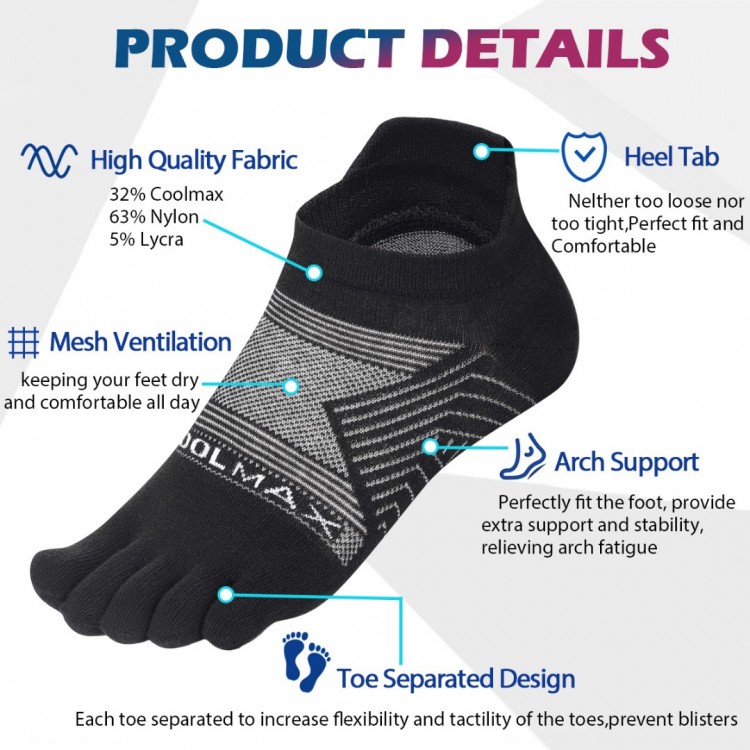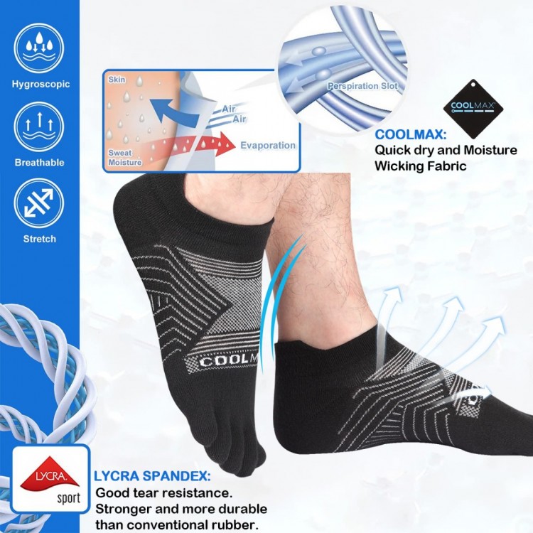 【Coolmax Toe Socks】32% Coolmax,63% Nylon,5% Lycra.These men's toe socks use breathable CoolMax fibers which provide quick moisture wicking performance,keeping your feet cool,dry and comfortable whole day.