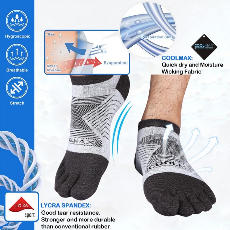 【Coolmax Toe Socks】32% Coolmax,63% Nylon,5% Lycra.These men's toe socks use breathable CoolMax fibers which provide quick moisture wicking performance,keeping your feet cool,dry and comfortable whole day.